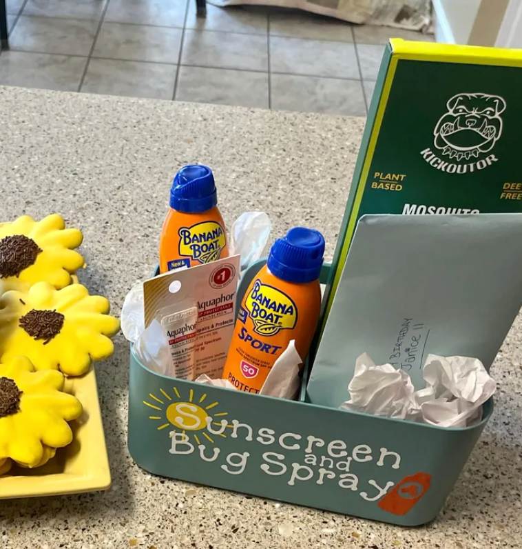 Sunscreen and Bug Spray Decal - Summer fun decor for pool parties, beach parties, birthday parties, and more. This is a great decoration to put on a sign, tub, bucket, or any flat, smooth surface. This listing is for the decal ONLY. All other items in the pictures are for styling purposes only.